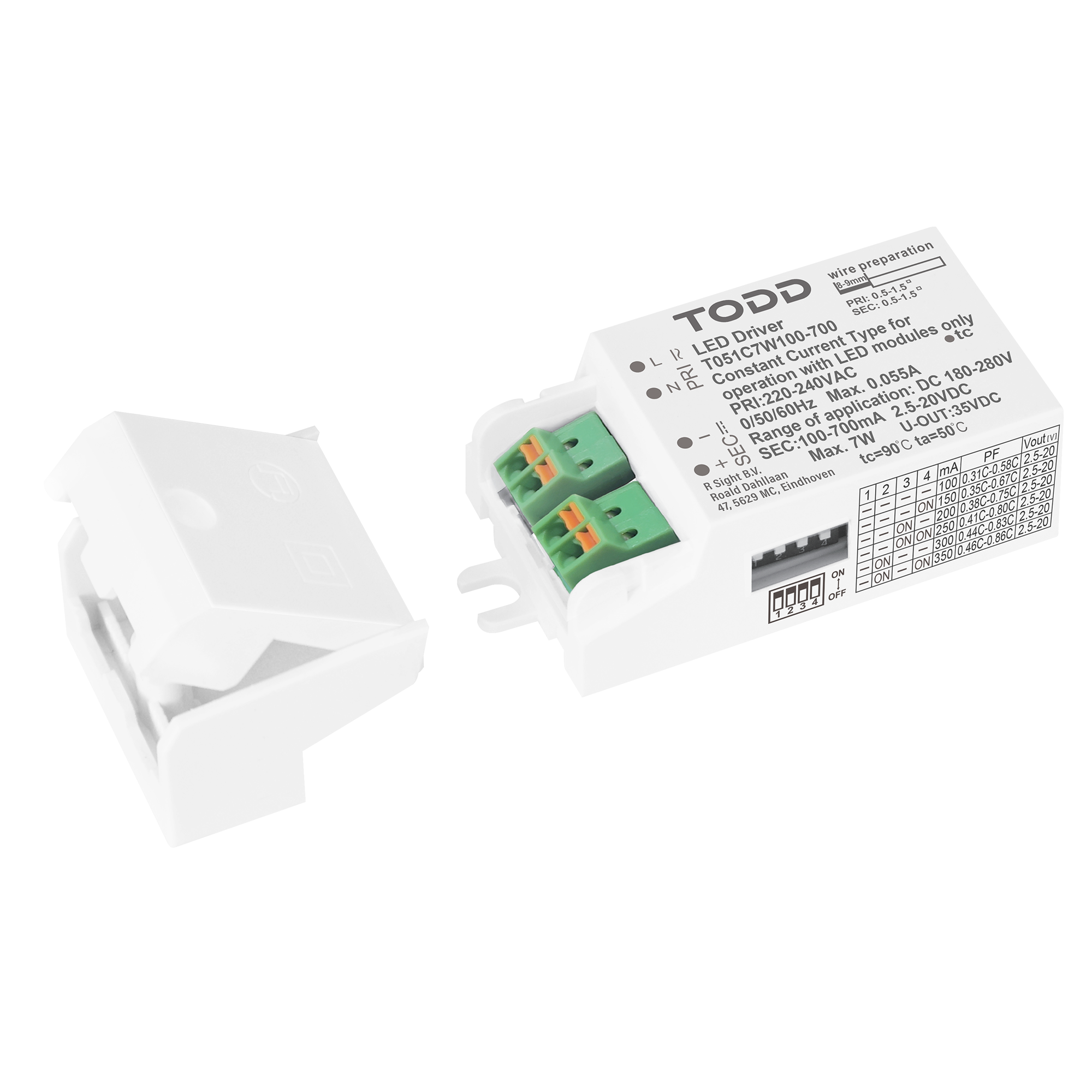 | Constant Current LED Driver Output Current adjustable via Dip Switch 100-700mA 2.5-20V up to 81-82% Efficiency Life Time 50.000h 5years warranty | Input Voltage 220-240VAC Frequency 0/50/60Hz Power Factor ≥0.88 current ripple (< 120 Hz) ±3% | IP Grade IP20 Insulation Class II Built-in/Independent 51.6x29x18mm | Overload Protection Short Circuit Protection SELV |